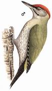 描述:中等体型(29厘米)的绿色啄木鸟。腰黄,顶冠红,颊灰。与灰头啄木鸟的区别在于具白色颊纹,腹部具绿色鳞状斑。雌鸟顶冠黑色。
