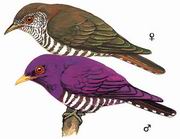 描述:体小(16厘米)的紫罗兰色(雄鸟)或铜绿色(雌鸟)杜鹃。雄鸟:头、胸及上体紫罗兰色,腹部白色具绛紫色横条纹。雌鸟:眉纹及脸颊白,下体白色具铜色条纹,头顶偏褐色,上体余部铜绿色。