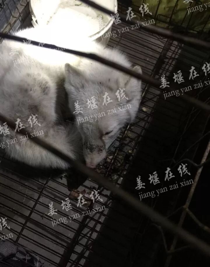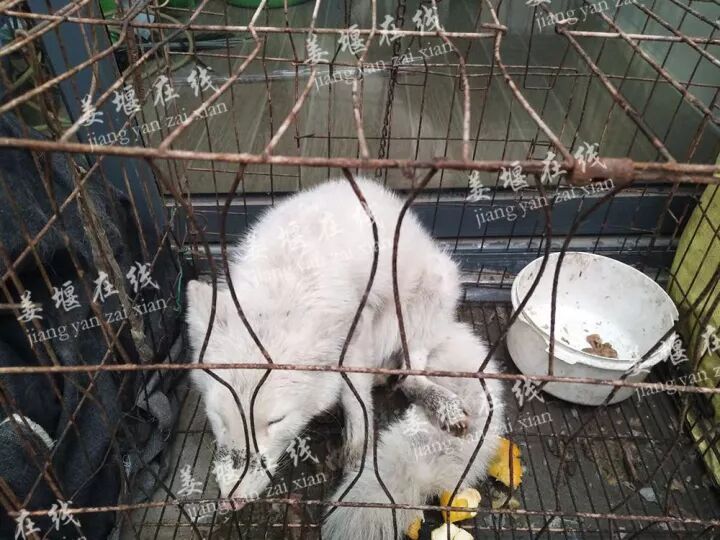 据了解,11月15日中午,姜堰区梁徐镇官野村村民曹大叔家门口出现了一只白色动物。这只白色动物一会儿钻进路边的垃圾箱寻找食物,一会儿在路上来回走动。村民们以为是野狗,怕其咬人,便把曹大叔从家里叫了出来。曹大叔觉得这只白色动物看起来像只狐狸狗,便在其他人的帮助下,把白色动物赶进了家里的一只铁笼。