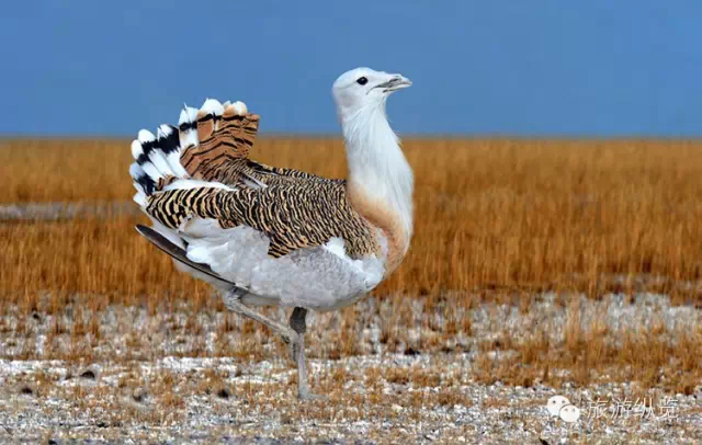 郭玉民给另一组人员打电话,通报发现大鸨的消息。等到后车赶到的时候,4只大鸨也许觉察到是陌生来客,便抬起头来,几步助跑,翩然离去,给人留下了优美的倩影。