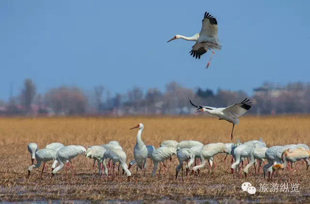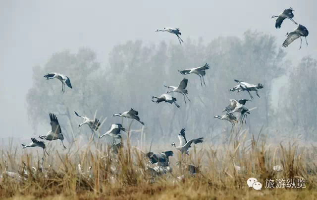 周海翔老师是一位生态学家,也是一位保护野生动物的斗士,多年来仗义直言,热心公益事业。他对獾子洞白鹤栖息地非常熟悉,在前面开车引路,辗转进入到鸟群醒来后去觅食地的通道附近。此时,东方天际一片红霞,成群的鹤、雁和鹳,像接受检阅的空中战鹰,在初升的阳光下次第掠过头顶,尤以白鹤的舞姿和队列最为优美。