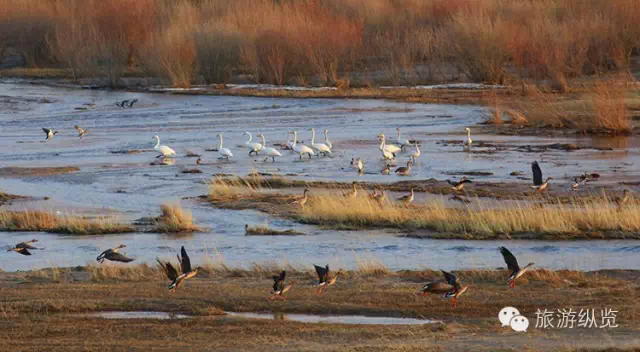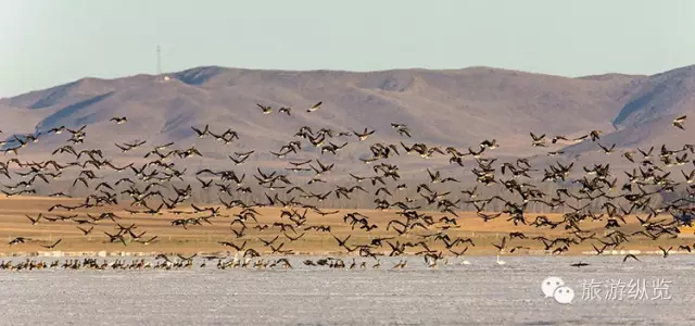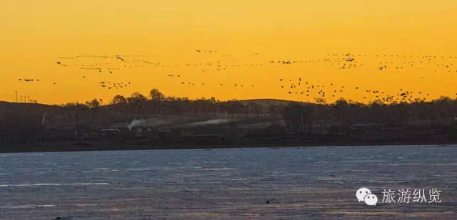 第二天日出前再次赶到监测站旁的湖边。6点10分,太阳从东方的山脊背后透出,大地一片金光。上万只雁鸭飞过,在逆光下与远山构成一幅恢宏优美的画面。湖面上还有成群的小天鹅休憩,优雅而恬静。