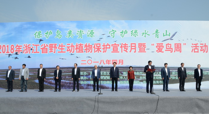省政协副主席周国辉宣布2018年全省野生动植物保护宣传月暨“爱鸟周”活动正式启动,省林业厅副厅长王章明在启动仪式上讲话,台州市委副书记、代市长张晓强致辞。台州市政协主席陈伟义,省政协人口资源坏境委员会专职副主任胡亚萍,台州市政协副主席李立飞等领导出席活动。台州市委常委、临海市委书记蔡永波主持启动仪式。