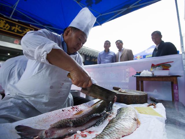 10月25日上午,在水乡溱潼古镇,喝彩声此起彼伏,笑声连连,香飘四方。一场别开生面的鱼饼虾球制作大赛如火如荼举行,现场大厨们纷纷拿出看家本领。一只手拿着菜刀,一只手拿着木棒,边切鱼肉边敲打。经过开、剐、剔、剁、泡、捏、搅、拌、烙、炸、烧等数十道工序流程一展绝技。
