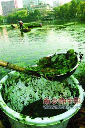工作人员正在打捞流花湖内的蓝藻。记者李向新摄