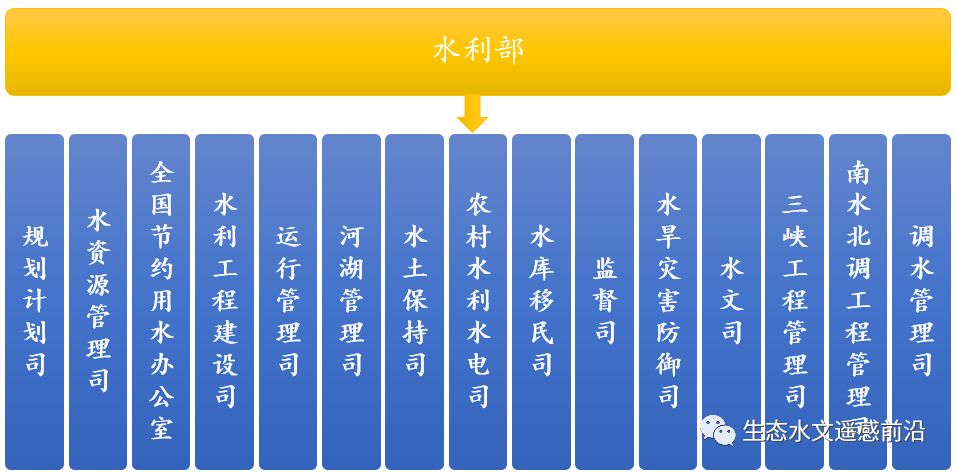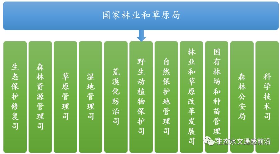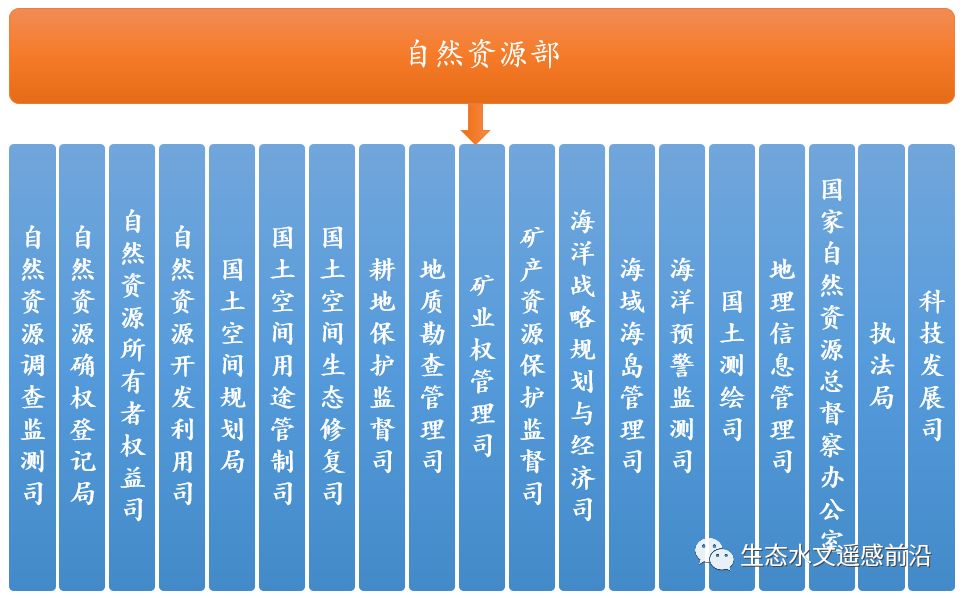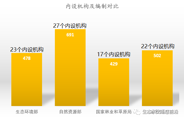 生态环境部设立自然生态保护司等23个内设机构;自然资源部设立自然资源调查监测司等27个内设机构;国家林业和草原局设立生态保护修复司等17个内设机构;水利部设立水资源管理司等22个内设机构。