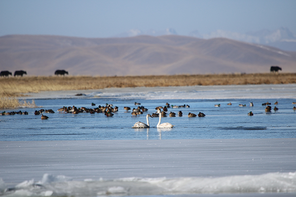 中国林业网12月31日讯 10月中旬以来,四川省若尔盖湿地管理局对若尔盖花湖水域内冬季栖息的水鸟数量和种类进了调査监测。截至12月24日的监测结果显示,花湖水域内大天鹅、绿头鸭、赤嘴鸭、针尾鸭、斑头雁等水鸟活动非常频繁。其中燕鸭类的数量达到1800余只,大天鹅有90余只。与去年同期比较,大天鹅的种群数量增加20余只,其它雁鸭类的数量也明显增多。这都得益于近年来保护区管理和宣传力度不断加大,持续开展湿地生态效益补偿项目和退化湿地恢复工程。湿地生态效益补偿项目和宣教活动的开展充分调动了牧民群众参与湿地保护的积极性,保护湿地就是保护家园的理念逐步深入人心,为保护高原湿地生态系统和以黑颈鹤为旗舰物种的众多野生动植物打下了坚实的基础,为四川省践行习近平生态文明思想,保护绿水青山提供了鲜活案例。(言迫 唐荣华 索朗夺尔基)