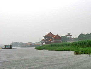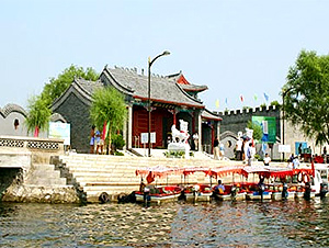 安新县鸳鸯岛占地6400平方米,改建投资3000万,归属民俗文化景区。从西拾阶而上,穿过汉白玉栏杆便踏入平坦宽阔的码头广场。首先映入眼帘的是高大的仿古牌楼,中央“鸳鸯岛”三个大字金光四射,两边“温馨醉客”四字充满神秘的诱惑。