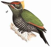 描述:中等体型(26厘米)的亮绿色啄木鸟。枕部冠羽具蓬松的黄色羽端,脸部具红色纹理及白色颊线。雄鸟以具红色的眉纹和颊纹以及白色的上颊纹为特征。雌鸟仅顶冠两侧带红。两胁具白色横斑,飞羽黑色。