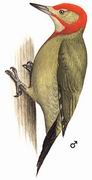 描述:体型略大(30厘米)的绿色啄木鸟。识别特征为头顶、枕、领及髭须纹均红。雌鸟头顶暗绿色。与雌花腹啄木鸟区别在腰色暗淡,下体无特征。