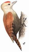 描述:体型中等(25 厘米)的红褐色啄木鸟,头淡皮黄色。上体纯红褐色为识别特征。与黄嘴栗啄木鸟区别在上体少黑色横纹。雄鸟前顶红色。亚种indochinensis头部橄榄金黄色,上体橄榄黄绿色,尾黑而基部橄榄色,下体橄榄褐色,雄鸟头顶及枕绯红。亚种 viridanus头浅皮黄,上体橄榄绿色沾红,尾绯红褐具浅栗色横斑,下体深橄榄绿色,雄鸟头顶及枕部玫红沾橘黄色。