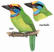 描述:体型略小(20厘米)的绿色拟啄木鸟。头部有蓝红黄黑四色。与其他拟啄木鸟区别在于体型略小,眉黑,颊蓝,喉黄,颈侧具红点。亚成鸟色彩较黯淡。