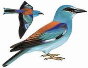 描述:体型略大(30厘米)的佛法僧。头、下体及前翼为明快的天蓝色,飞羽黑,上背、背及三级飞羽粉棕色。