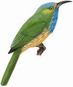 描述:中等体型(30厘米)的绿色林栖型蜂虎,蓝色的胸羽蓬松,嘴厚重而下弯。成鸟顶冠淡蓝,腹部棕黄带绿色纵纹。尾羽腹面黄褐。亚成鸟全身绿色。