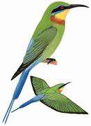 描述:体型略大(30厘米,包括延长的中央尾羽)、体态优雅的蜂虎。黑色的过眼纹上下均蓝色,头及上背绿,腰、尾蓝,颏黄,喉栗,腹部浅绿。飞行时下翼羽橙黄色。
