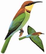 描述:体型略小(20厘米)的绿色及棕色蜂虎。中央尾羽不形延长。头顶、枕及上背亮栗色,两翼及尾绿,腰艳蓝,喉黄而缘栗,黑色的前领纹过上颊,腹部浅绿,贯眼纹黑。飞行时翼下可见橙黄色。