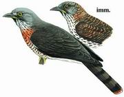 描述:略显型大(40厘米)的灰褐色鹰样杜鹃。尾部次端斑棕红,尾端白色;胸棕色,具白色及灰色斑纹;腹部具白色及褐色横斑而染棕;颏黑色。亚成鸟:上体褐色带棕色横斑;下体皮黄而具近黑色纵纹。与鹰类的区别在其姿态及嘴形。