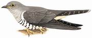 描述:体小(26厘米)的灰色杜鹃。腹部具横斑。上体灰色,头、颈及上胸浅灰。下胸及下体余部白色具清晰的黑色横斑,臀部沾皮黄色。尾灰,无横斑但端具白色窄边。雌鸟似雄鸟但也具棕红色变型,全身具黑色条纹。眼圈黄色。似大杜鹃但体型较小,以叫声最易区分。