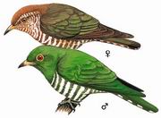 描述:体小(17厘米)的亮绿色杜鹃。雄鸟:头、上体及胸亮绿色,腹部白色具绿色横条纹。雌鸟:头顶及枕部棕色,上体铜绿,下体白色具深皮黄色横斑。亚成鸟头棕色,顶具条纹。飞行时翼下飞羽根部具一白色宽带。
