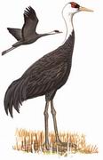 描述:体小(97厘米)的深灰色鹤。头颈白色,顶冠前黑而中红飞行时飞羽黑色。亚成鸟头、颈沾皮黄色,眼斑黑色。