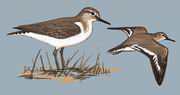 描述:体型略小(20厘米)的褐色及白色鹬。嘴短,性活跃,翼不及尾。上体褐色,飞羽近黑;下体白,胸侧具褐灰色斑块。特征为飞行时翼上具白色横纹,腰无白色,外侧尾羽无白色横斑。翼下具黑色及白色横纹。