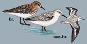 描述:体型略小(20厘米)的近灰色涉禽。肩羽明显黑色。比其他滨鹬白,飞行时翼上具白色宽纹;尾中央色暗,两侧白。特征为无后趾。夏季鸟上体赤褐色。