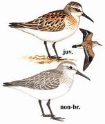 描述:体小(16厘米)的滨鹬。黑而健的嘴略下弯,腿近黑。繁殖羽赤褐,胸部多纵纹。冬季时上体褐灰,脸及下体白色。具暗色的过眼纹,眉纹白,上胸两侧具暗色纵纹。较黑腹滨鹬色浅而多灰色;嘴比弯嘴滨鹬直;色彩较姬滨鹬单调而深沉。嘴较略小的青脚滨鹬为长。