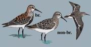 描述:体小(19厘米)而嘴适中的偏灰色滨鹬。眉纹白色,嘴端略有下弯,尾中央黑而两侧白。与弯嘴滨鹬的区别在腰部色深,腿较短,胸色较暗。与阔嘴鹬的区别在腿较粗,头部色彩单调,仅为一道眉纹。夏羽特征为胸部黑色,上体棕色。
