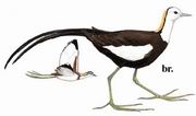 描述:体型略大(33厘米)、尾特长的深褐色及白色水雉。飞行时白色翼明显。非繁殖羽头顶、背及胸上横斑灰褐色;颏、前颈、眉、喉及腹部白色;两翼近白。黑色的贯眼纹下延至颈侧,下枕部金黄色。初级飞羽羽尖特长,形状奇特。