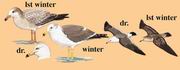 描述:中等体型(47厘米)的鸥。两翼长窄,上体深灰,腰白,尾白而具宽大的黑色次端带。冬季头顶及颈背具深色斑。合拢的翼尖上具四个白色斑点。第一冬的鸟多沾褐,脸部色浅,嘴粉红而端黑,尾黑,尾上覆羽白。第二年似成鸟但翼尖褐色,尾上黑色较多。