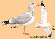 描述:银鸥复合体中体大(64厘米)的浅灰色鸥。腿淡粉红色,上体浅灰。冬鸟头及颈具纵纹。三级飞羽的白色月牙形宽,但肩部月牙较窄。外形厚重,胸深,嘴厚,前额长缓而下,头顶平坦,外貌看似凶狠。飞行时初级飞羽外侧羽上具小块翼镜。翼合拢时至少可见六枚白色羽尖。第四年成鸟羽衣长成。第一冬鸟具褐色杂斑,嘴黑色。第二冬鸟色略淡而多灰色,嘴黄色而端黑。幼鸟似其他银鸥。