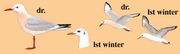 描述:体略小(42厘米)的鸥。特征为红色的嘴纤细,脚红,下体偏粉红。飞行时初级飞羽白而羽端黑色。侧看颈部短粗,头前倾而下斜。非繁殖期的鸟耳上具灰点。第一冬的鸟嘴橘黄色,眼先及耳后具黑色小斑。翼略具褐色杂斑,尾具黑色次端横带。与红嘴鸥越冬鸟的区别在耳上深色点斑模糊,嘴端无黑色,嘴纤细,颈较僵硬,嘴及腿的橘黄色较深。飞行时颈及尾显长,弓背。