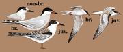 描述:体型略小(35厘米)、头顶黑色的燕鸥。尾深叉型。繁殖期:整个头顶黑色,胸灰色。非繁殖期:上翼及背灰色,尾上覆羽、腰及尾白色,额白,头顶具黑色及白色杂斑,颈背最黑,下体白。飞行时,非繁殖期成鸟及亚成鸟的特征为前翼具近黑的横纹,外侧尾羽羽缘近黑。第一冬鸟上体褐色浓重,上背具鳞状斑。