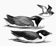 描述:体型略小(25厘米)的黑白色海雀。头厚,嘴粗短而色浅,形似企鹅。繁殖期的特征为头无羽冠,背蓝灰,下体白色,喉黑,白色的眉纹呈散开形。非繁殖期眉纹及喉部的黑色消失。飞行时翼下白色,前后缘均色深,腋羽色暗。