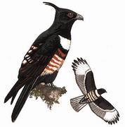描述:体型略小(32厘米)的黑白色鹃隼。黑色的长冠羽常直立头上。整体体羽黑色,胸具白色宽纹,翼具白斑,腹部具深栗色横纹。两翼短圆,飞行时可见黑色衬,翼灰而端黑。飞行时振翼如鸦,滑翔时两翼平直。