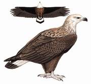 描述:体大(80厘米)的深褐色海雕雕。头、颈及胸金皮黄,楔尾且尾下具白色宽带为其特征。亚成鸟棕褐色,飞行时黑色的次级飞羽翼下的浅色中覆羽并黑色楔型尾与浅色基部成对比。翼下初级飞羽基部浅色斑纹明显。耳覆羽及过眼线深褐。颈上矛状尖羽形成翎颌。