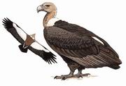 描述:体大(84厘米)的鹫。特征为尾圆而短,颈长而裸出。飞行时从下边看,白色翼下覆羽及白色领环与近黑色的飞羽及深褐色下体成反差。上体大致偏黑,次级飞羽深灰,腰略白。亚成鸟褐灰而无白色。两翼略呈"V"形在高空翱翔。