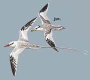 描述:体型略大(46厘米,不包括尾部飘带)的偏白色海鸟。成鸟:以红嘴、上体具横斑及尾部的白色飘带为特征。初级飞羽外侧翈黑色。幼鸟/亚成鸟与白尾鹲及红尾鹲的区别在上体具致密的细横纹,及特征性的宽阔过眼纹延至颈后成后颈圈。