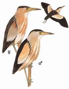描述:体小(35厘米)的偏黄色或黑白色苇鳽。成年雄鸟绒白色,顶冠黑色,两翼黑色具近白色的大块斑,嘴红色。雌鸟黄褐色,上体具褐色纵纹,下体略具纵纹,翼褐色而具皮黄色块斑。幼鸟似缩小了的大麻鳽,多具杂斑和纵纹。