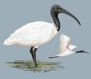 描述:体大(76厘米)的白色鹮。头黑色,嘴长而下弯,尾为灰色的蓬松丝状三级覆羽所覆盖。