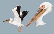 描述:体型甚大(160厘米)的白色鹈鹕。体羽粉白,仅初级飞羽及次级飞羽褐黑。头后具短羽 冠,胸部具黄色羽簇。亚成鸟褐色。