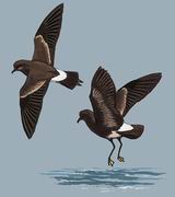 描述:体小(17厘米)的小巧深褐色海燕。尾无叉,腰及尾下覆羽白色。两翼宽而短,翼的前后缘均缺少明显角度。尾短,飞行时脚伸出尾后。深色的飞羽及浅色的翼上下大覆羽成强烈对比。