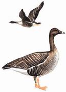 描述:体型大(80厘米)的灰色雁。与Pink-footed Goose类似但脚为橘黄色;颈色暗,嘴黑而具橘黄色次端条带。飞行中较其他灰色雁类色暗而颈长。上下翼无Pink-footed 或灰雁的浅灰色调。
