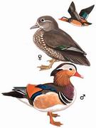 描述:体小(40厘米)而色彩艳丽的鸭类。雄鸟有醒目的白色眉纹、金色颈、背部长羽以及拢翼后可直立的独特的棕黄色炫耀性"帆状饰羽"。雌鸟不甚艳丽--亮灰色体羽及雅致的白色眼圈及眼后线。雄鸟的非婚羽似雌鸟,但嘴为红色。