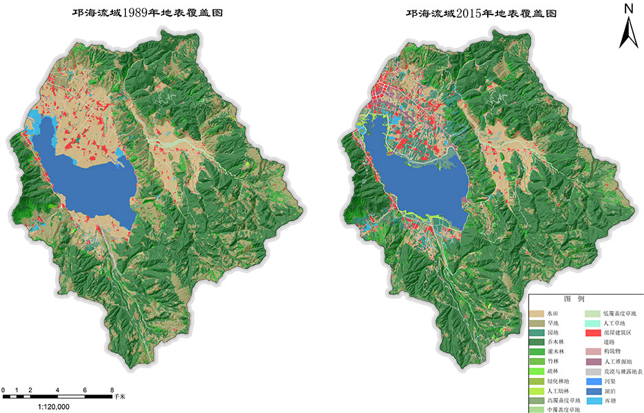 邛海流域1989年和2015年地表覆盖空间分布对比图——富锦湿地 建设气象监测站,成立野生动物救护站,开展了水鸟、水文水质、气象、野生动物疫源疫病等监测及鸟类环志工作,成功申请立项了“貉藻的生态学特征及就地保护项目” 。